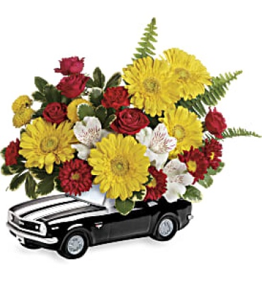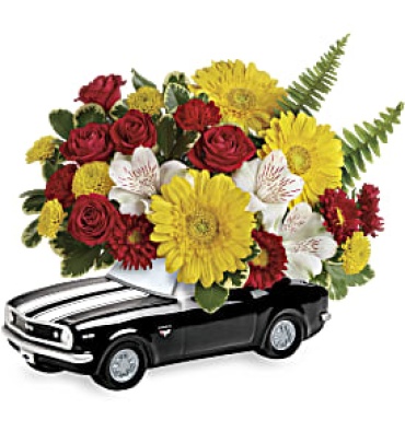 This colorful arrangement includes miniature yellow gerberas, white alstroemeria, red miniature carnations, red matsumoto asters, yellow button spray chrysanthemums, variegated pittosporum and sword fern. Delivered in a '67 Chevy Camaro keepsake. Approximately 12" W x 10 1/4" H