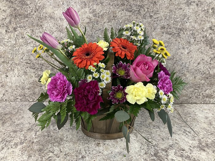 A gorgeous display of tulips, gerbera daisies, roses, monte cassino, miniature black eyed susans, and assorted carnations all set in a rustic but elegant brown oval woodchip basket. Send this one to let someone know you're thinking of them, no matter what the reason.
