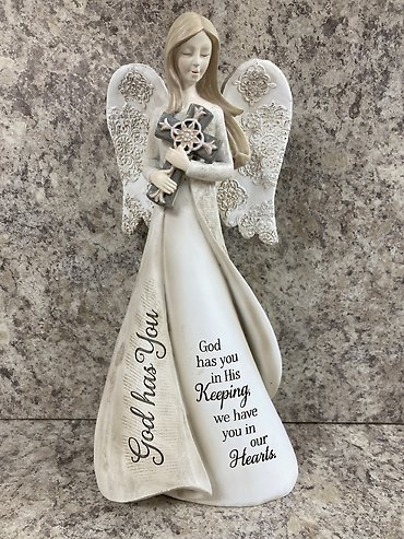 Express your heartfelt sympathy with this lovely angel statue. Her dress is inscribed with the comforting words "God has you...God has you in his keeping, we have you in our hearts."